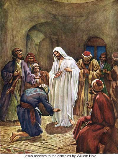 Vào buổi chiều ngày thứ nhất trong tuần, những cửa nhà các môn đệ họp đều đóng kín, vì sợ người Do-thái, Chúa Giêsu hiện đến, đứng giữa các ông và nói rằng: "Bình an cho các con". Khi nói điều đó, Người cho các ông xem tay và cạnh sườn Người. Bấy giờ các môn đệ vui mừng vì xem thấy Chúa. Chúa Giêsu lại phán bảo các ông rằng: "Bình an cho các con. Như Cha đã sai Thầy, Thầy cũng sai các con". Nói thế rồi, Người thổi hơi và phán bảo các ông: "Các con hãy nhận lấy Thánh Thần, các con tha tội ai, thì tội người ấy được tha. Các con cầm tội ai, thì tội người ấy bị cầm lại". Bấy giờ trong Mười hai Tông đồ, có ông Tôma gọi là Ðiđymô, không cùng ở với các ông khi Chúa Giêsu hiện đến. Các môn đệ khác đã nói với ông rằng: "Chúng tôi đã xem thấy Chúa". Nhưng ông đã nói với các ông kia rằng: "Nếu tôi không nhìn thấy vết đinh ở tay Người, nếu tôi không thọc ngón tay vào lỗ đinh, nếu tôi không thọc bàn tay vào cạnh sườn Người, thì tôi không tin".