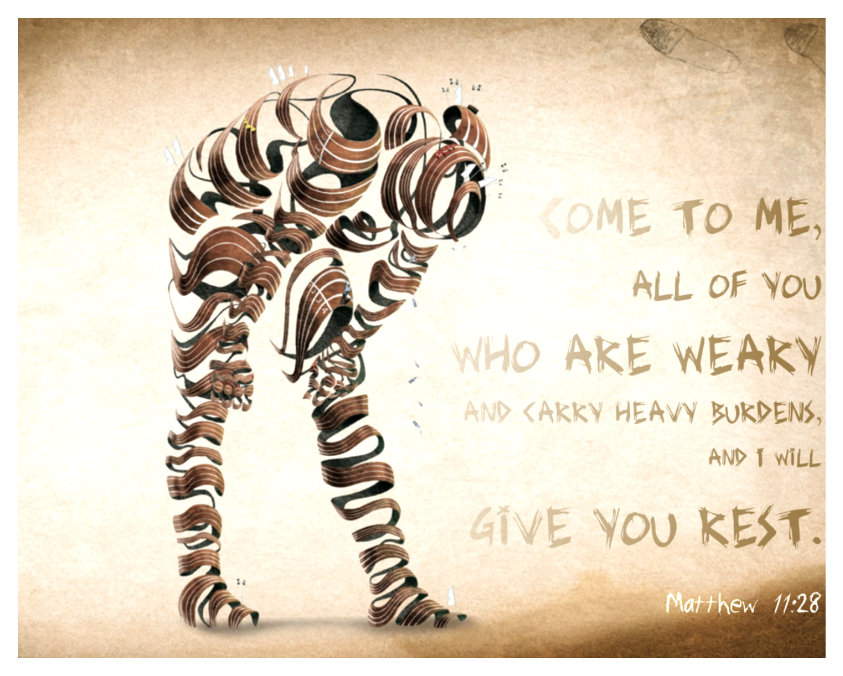 "Hãy đến với Ta tất cả, hỡi những ai mệt mỏi và gánh nặng, Ta sẽ nâng đỡ bổ sức cho các ngươi. Hãy mang lấy ách của Ta và hãy học cùng Ta, vì Ta hiền lành và khiêm nhượng trong lòng, và tâm hồn các ngươi sẽ gặp được bình an. Vì ách của Ta thì êm ái và gánh của Ta thì nhẹ nhàng".