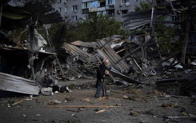 Một người đàn ông lớn tuổi đi ngang qua một cửa hàng xe hơi bị phá hủy sau cuộc tấn công của Nga ở Zaporizhzhia