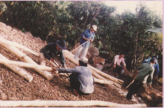 Sau vụ lúa, anh em Đội XII6 đáng luống chuẩn bị trồng khoai lang (hình phải)