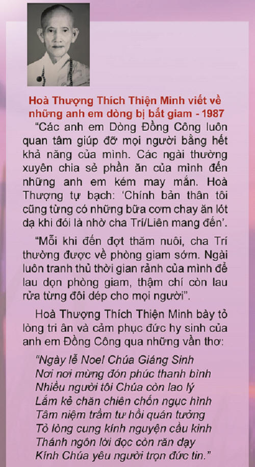 Chính vị hòa thượng viết bài về Cha Trần Đình Thủ và hòa thượng Thích Đức Nhuận trên đây còn bày tỏ cảm nhận của mình về chung anh em tù nhân Đồng Công, đặc biệt là Anh Linh mục Liên (LK 5 sau này bị tâm thần), cũng ở Trại tù Xuân Lộc Đồng Nai đối với bản thân ngài cũng như đối với chung các tù nhân khác như sau: