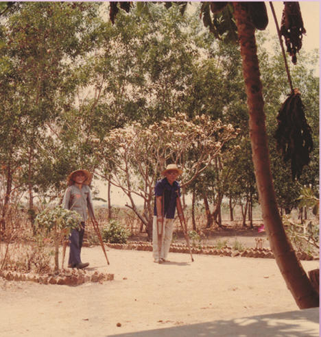 Hình trái: Trong chế độ hà khắc hai anh tật nguyền chống nạng là Hà (LK 4) và Giản (LK 3) cũng không được miễn trừ;
